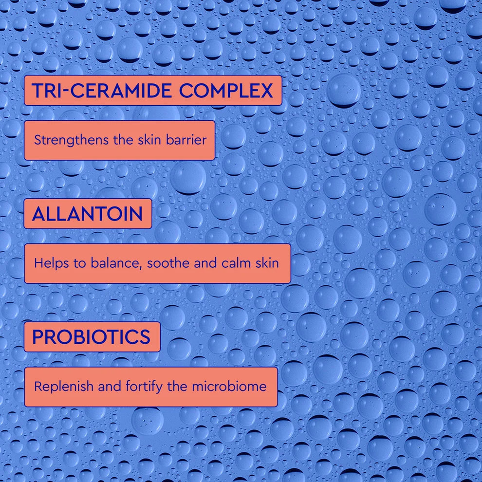 Our barrier boosting Tri-Ceramide Complex (Ceramides, Cholesterol, Fatty Acids) plus a powerful duo of Allantoin and probiotic ferment help to immediately hydrate the skin and support the microbiome, shielding skin from environmental stressors and calming dry irritated skin.