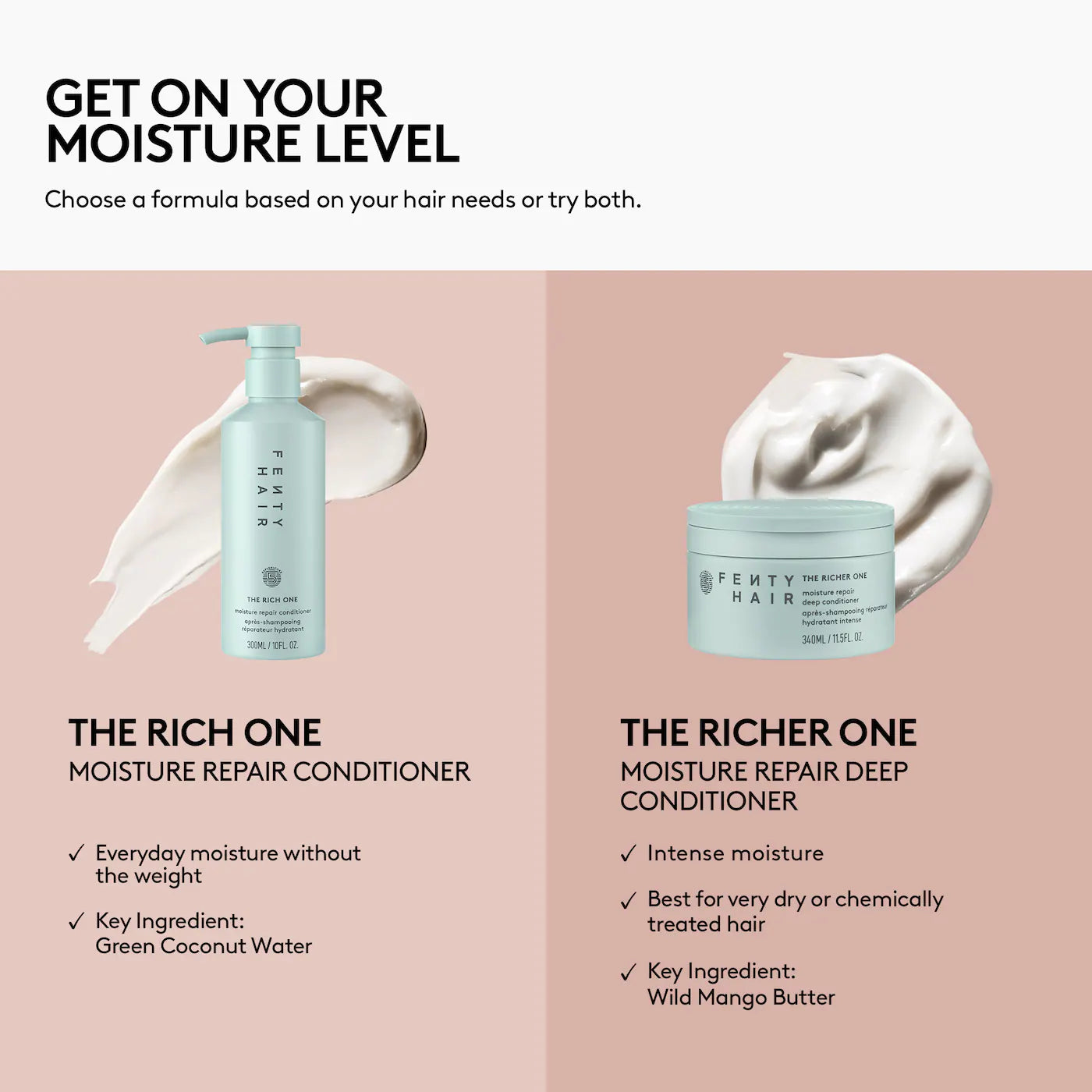 -After shampooing with Fenty Beauty by Rihanna’s The Rich One Moisture Repair Shampoo (sold separately), apply to wet hair.
