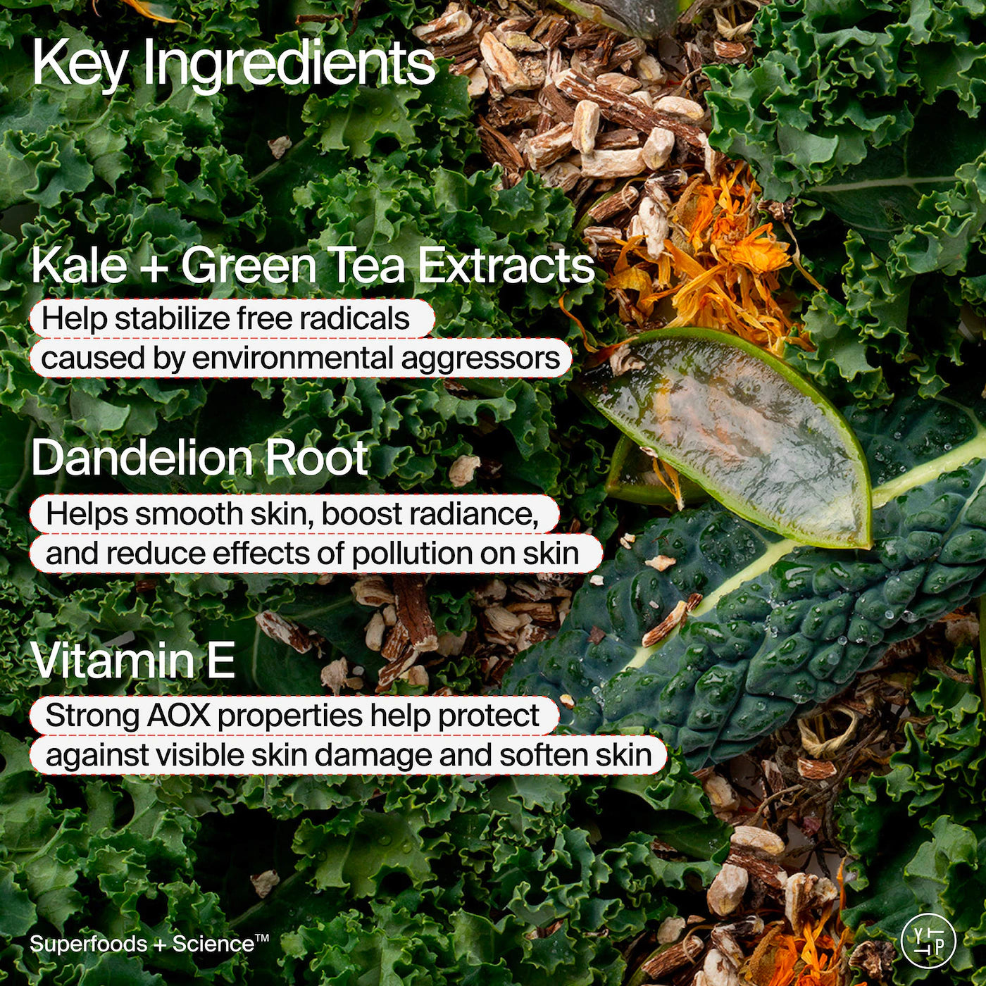 - Kale and Green Tea Extracts: Fights free radical damage caused by environmental aggressors.